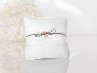 Dekorační krajkový polštářek v bílé barvě s hnědou stuhou. Skvělý doplněk na svatby.
