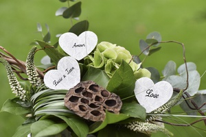 Dekorace v podobě bílých krajkových srdíček. Možno použít také jako jmenovky.