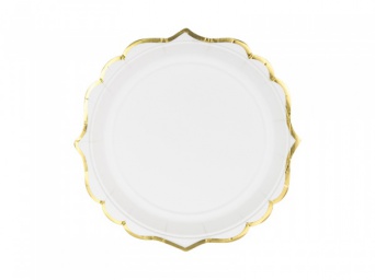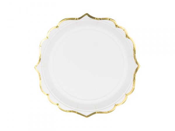 Velmi elegantní papírové talířky v bílé barvě se zlatým zdobným okrajem na svatební raut nebo zahradní oslavu.