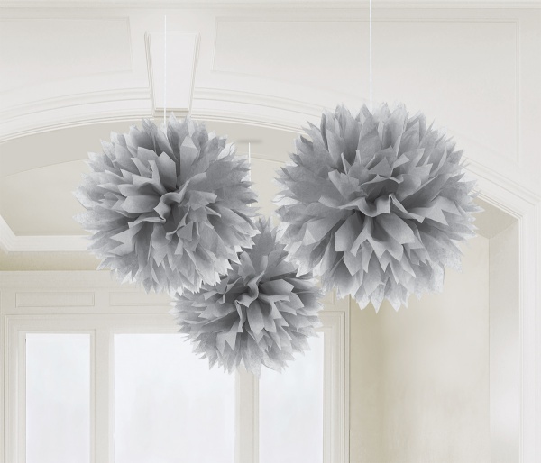 Ideální pro výzdobu na narozeninovou či jinou párty. Hedvábné dekorativní koule k zavěšení ve stříbrné barvě.